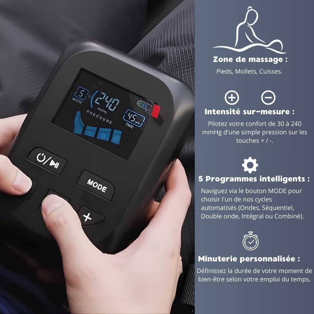 • Détente Profonde : Une pression douce et rythmée qui libère les tensions et revitalise vos jambes fatiguées.
